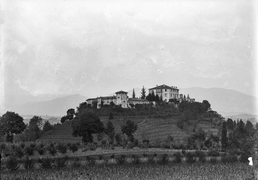 Veduta del castello De Valentinis a Tricesimo. Il castello medievale fu costruito prima del XIII secolo su una collina morenica, come si vede nell'immagine e protetto da torrioni circolari e torri di guardia.