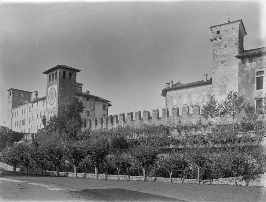 Veduta del Castello di Colloredo Mels a Monte Albano, della torre dell'orologio e della cinta muraria. Fu eretto a partire dal 1302 dal Barone Guglielmo di Waldsee, Visconte di Mels; sempre più ingrandito attraverso i secoli, subì una lenta e costante sostituzione delle caratteristiche difensive con quelle più propriamente residenziali.