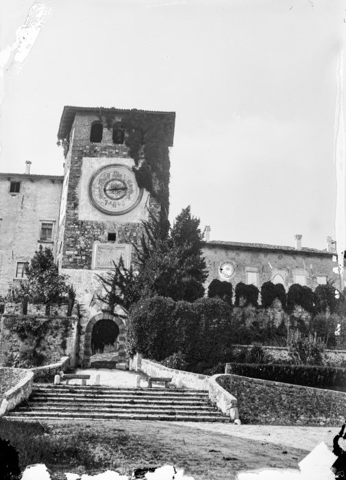 Veduta del Castello di Colloredo Mels a Monte Albano, della scalinata che conduce alla della torre dell'orologio. Fu eretto a partire dal 1302 dal Barone Guglielmo di Waldsee, Visconte di Mels; sempre più ingrandito attraverso i secoli, subì una lenta e costante sostituzione delle caratteristiche difensive con quelle più propriamente residenziali.