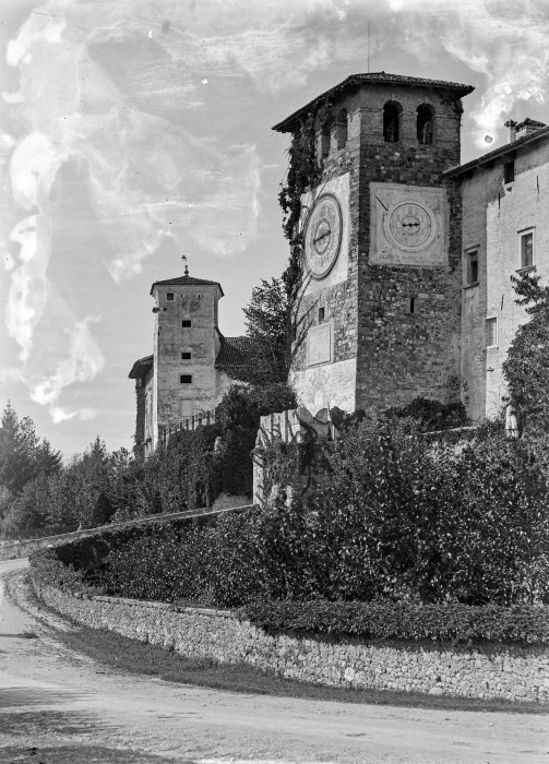 Veduta del Castello di Colloredo Mels a Monte Albano,della torre dell'orologio e della cinta muraria.