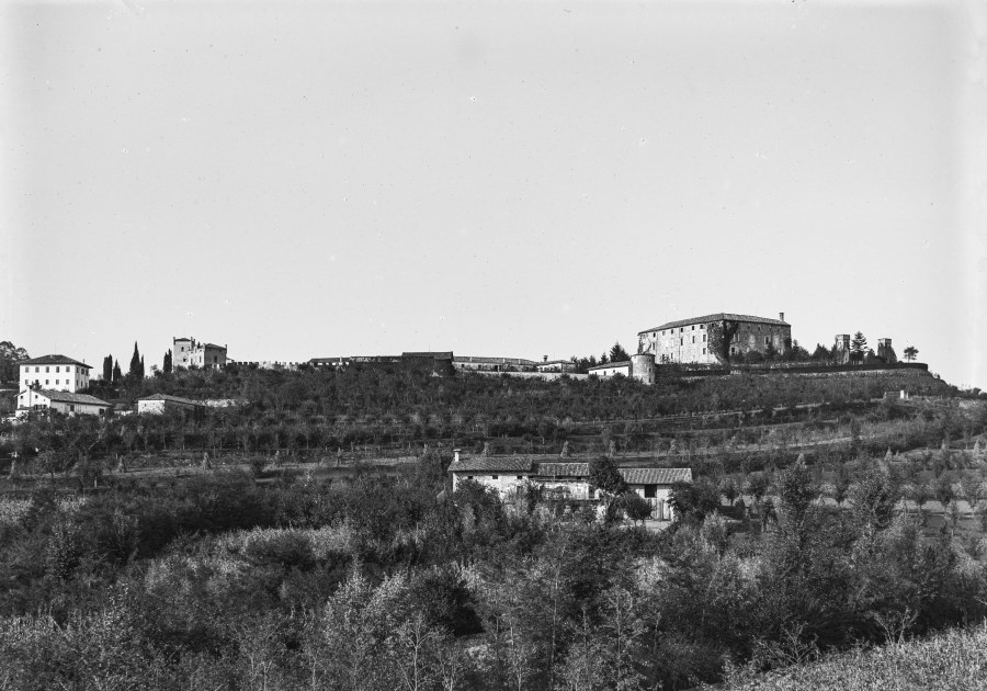 Veduta del Castello di Moruzzo, della cinta muraria e della collina su cui sorge.