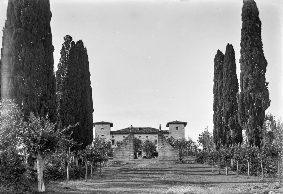 Veduta occidentale del Castello di Susans a Majano con il viale d'ingresso. Citato per la prima volta nell'anno 1031 come "villa de Suzan", coinvolto in numerose vicende belliche la rocca passa dai Varmo Pers ai signori di Colloredo Mels. Più volte distrutto e ricostruito.