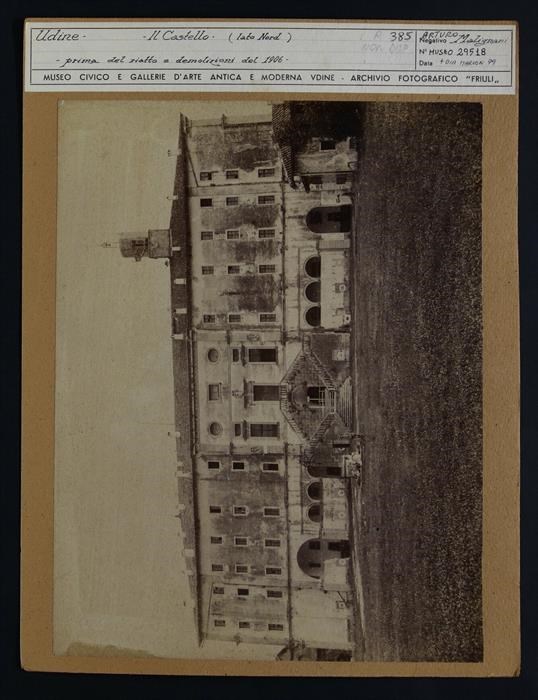 Udine: facciata posteriore del castello prima del 1906, anno in cui è diventato sede museale. Malignani è vissuto sul colle del castello, dove ha installato una stazione meteorologica.