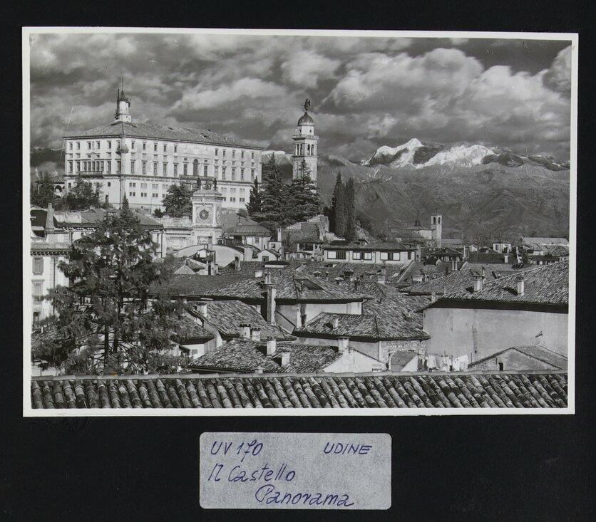 Udine: veduta di uno scorcio della città. Sullo sfondo, a sinistra, il castello e il campanile cinquecentesco della chiesa di Santa Maria di Castello, progettato da Gaspare Negro. Davanti, la Loggia di San Giovanni, in cui si innesta la Torre dell'Orologio, di Giovanni da Udine (1527), sita in piazza Libertà. Sullo sfondo, a destra, le Alpi.