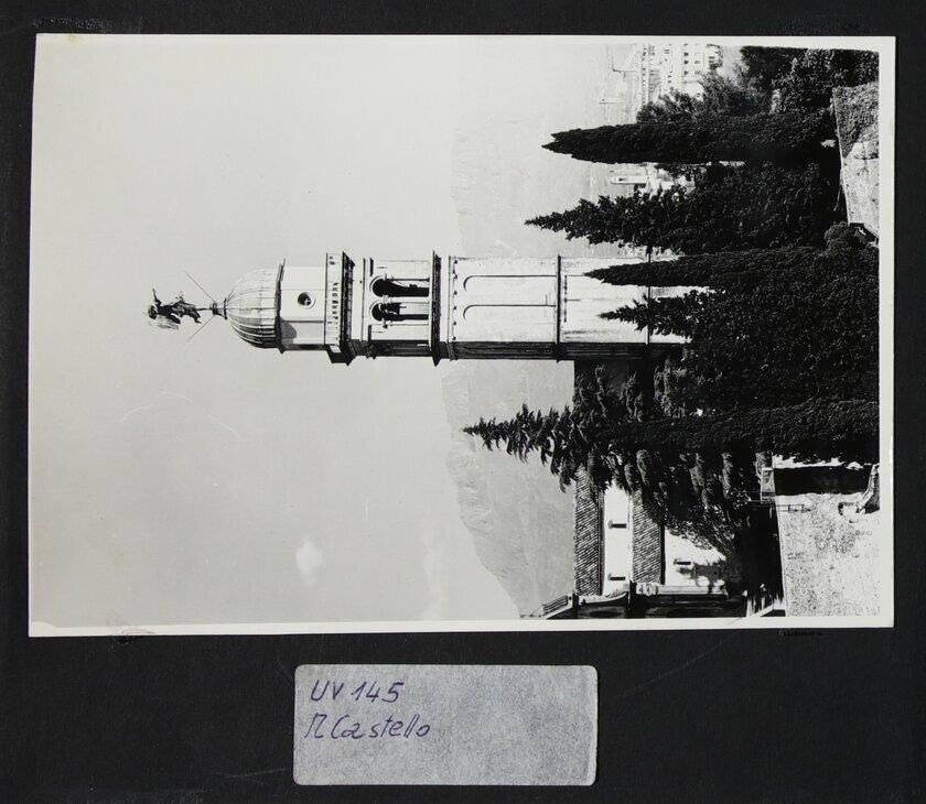 Udine: la scultura dorata e girevole con l'arcangelo Gabriele in cima alla cupola emisferica, portata a termine da Giovanni da Udine, appartenente al campanile cinquecentesco della chiesa di Santa Maria di Castello, progettato da Gaspare Negro. Sullo sfondo, il resto della città (a destra) e le Alpi.