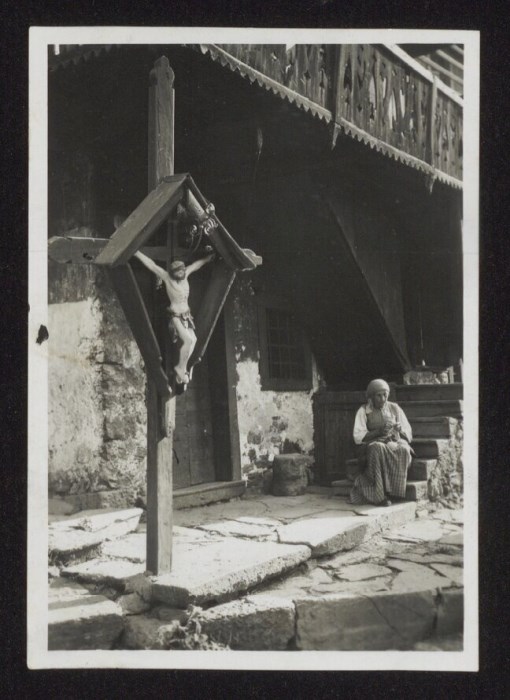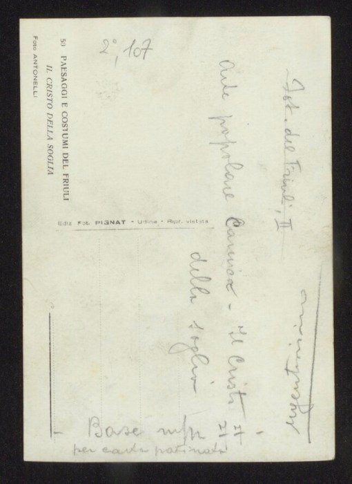 Lo scatto di Umberto Antonelli, farmacista e fotografo attivo in Carnia tra 1909 e 1949, è parte della serie di cartoline pubblicate dal fotografo editore Carlo Pignat con il titolo "Paesaggi e Costumi del Friuli" nella seconda metà degli anni Trenta del Novecento, raffiguranti tutte una Carnia e un Friuli arcadici.