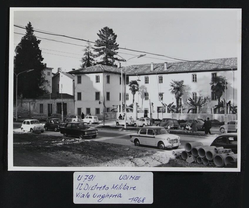 Udine, viale Ungheria: veduta - verso piazza Patriarcato - con abitazioni, la palazzina del Distretto Militare e varie automobili. A destra, tubi dell'acqua potabile. Si noti che viale Ungheria, essendo ancora in costruzione, stava prendendo forma a seguito dei bombardamenti della seconda guerra mondiale (anni Cinquanta e Sessanta); infatti diverse case vennero abbattute a favore di nuovi interventi urbanistici.