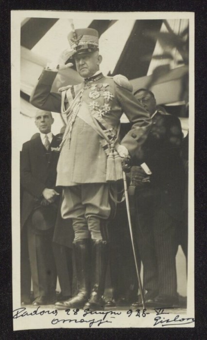 Ritratto del duca d'Aosta Amedeo III di Savoia a Padova nel giorno del decimo anniversario della battaglia del Piave nel gesto del saluto militare dell' "attenti", alle sue spalle altri nobili.