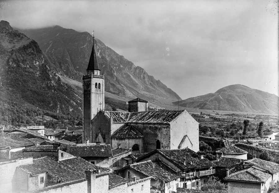Veduta sopraelevata del Duomo di Venzone, dei tetti delle case e delle montagne come fondale.