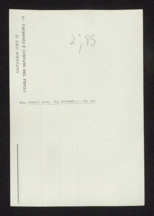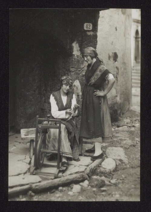 Lo scatto di Umberto Antonelli, farmacista e fotografo attivo in Carnia tra 1909 e 1949, è parte della serie di cartoline pubblicate dal fotografo editore Carlo Pignat con il titolo "Paesaggi e Costumi del Friuli" nella seconda metà degli anni Trenta del Novecento, raffiguranti tutte una Carnia e un Friuli arcadici. L'immagine ritrae due donne in abiti tradizionali carnici: una delle due sta filando seduta sulla porta della casa, l'altra la osserva in piedi.