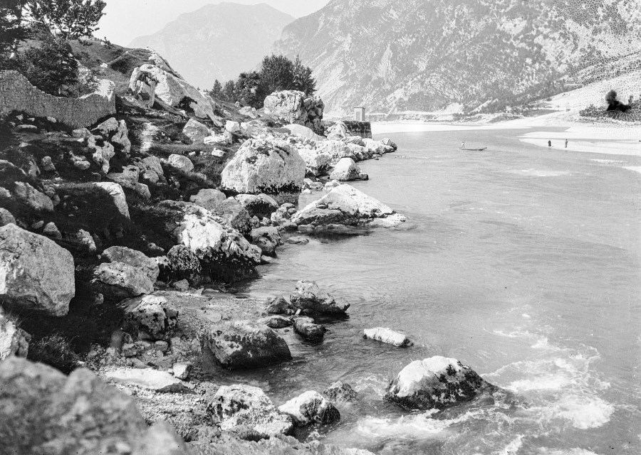 Veduta del fiume Tagliamento che scorre fra le montagne; in lontananza una persona con una piccola imbarcazione attraversa il fiume per raggiungerne altre due sulla riva opposta.