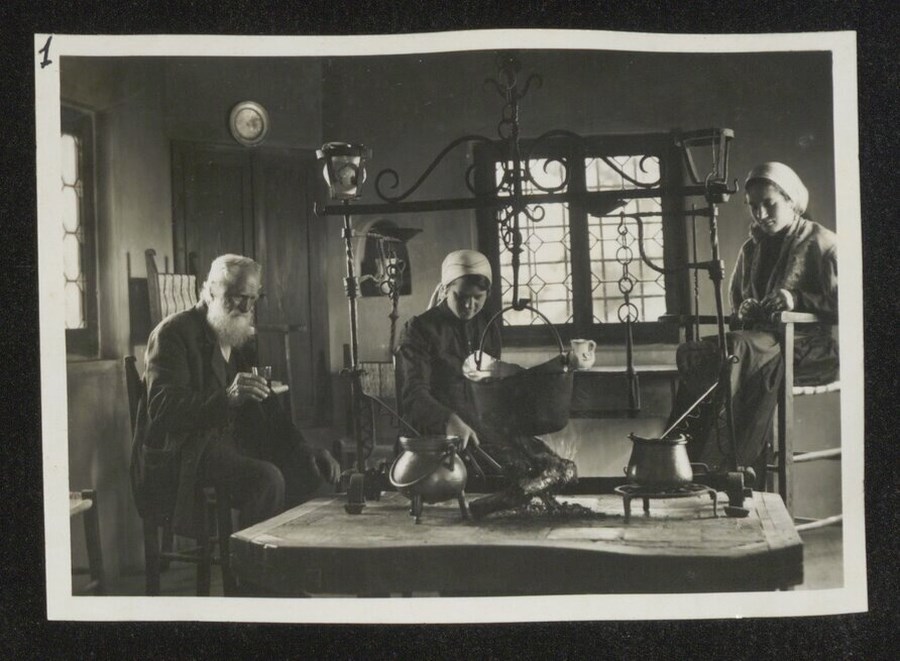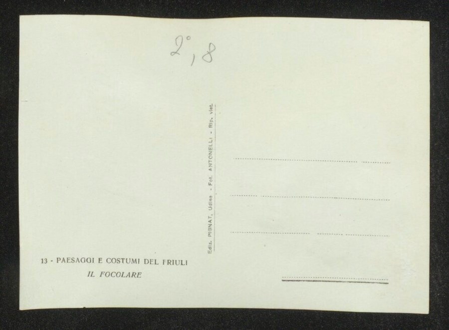 Lo scatto di Umberto Antonelli, farmacista e fotografo attivo in Carnia tra 1909 e 1949, è parte della serie di cartoline pubblicate dal fotografo editore Carlo Pignat con il titolo "Paesaggi e Costumi del Friuli" nella seconda metà degli anni Trenta del Novecento, raffiguranti tutte una Carnia e un Friuli arcadici. L'immagine ritrae un uomo anziano con la barba e due donne in costume tradizionale carnico accanto al focolare ("fogolâr") della casa detta "das Toscjanas" a Enemonzo (edificio demolito dopo il terremoto del 1976). Dalla cappa pende una catena a cui è agganciato un tipico bronzino carnico. Una delle due donne è seduta sulla tradizionale sedia alta che spesso correda il fogolâr friulano.