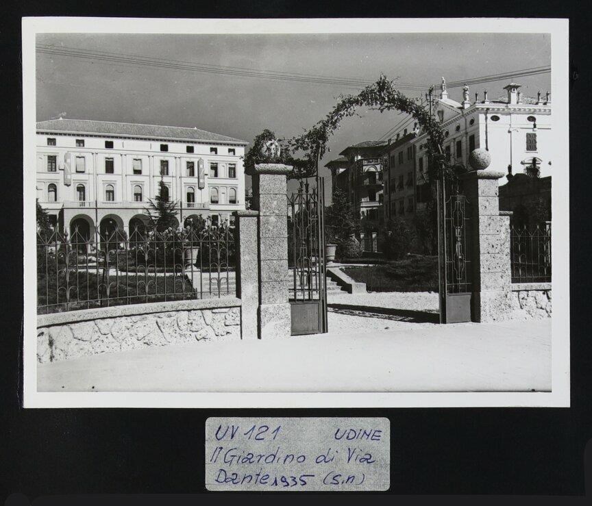 Udine: veduta del Giardino "Giovanni Pascoli" progettato da Ettore Gilberti (inizi degli anni Trenta del Novecento), in origine chiamato "Giardini pubblici Arnaldo Mussolini". In primo piano, la recinzione. In secondo piano, a sinistra, la Casa del Littorio, costruita sotto la direzione dei lavori di Ettore Gilberti (1931-1932). In secondo piano a destra, Palazzo del Torso dell'architetto Provino Valle (1925-1926), sito in via Giosuè Carducci 44 e inizialmente di proprietà dei Conti del Torso. L'edificio, realizzato in stile neopalladiano, presenta un timpano con sculture a tutto tondo e stemma famigliare. Più indietro, la casa e bottega del fotografo Attilio Brisighelli e Palazzo Vuga di Ettore Gilberti (1910).