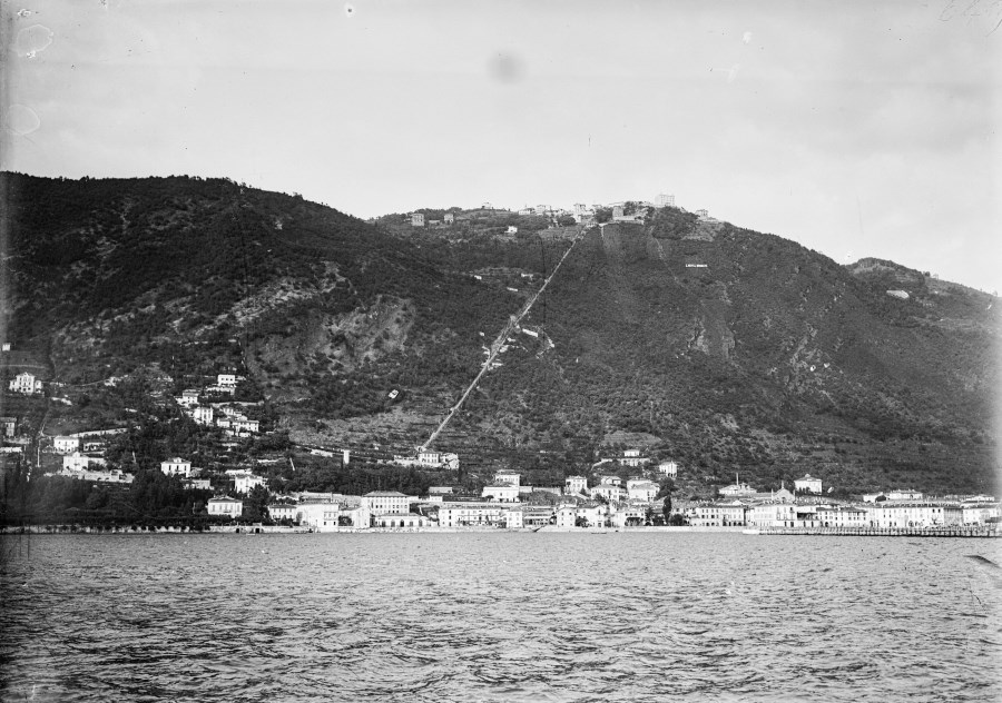 Veduta del Lago di Como e del paese di Brunate situato su un altopiano boscoso raggiungibile attraverso la funicolare che si vede nell'immagine.