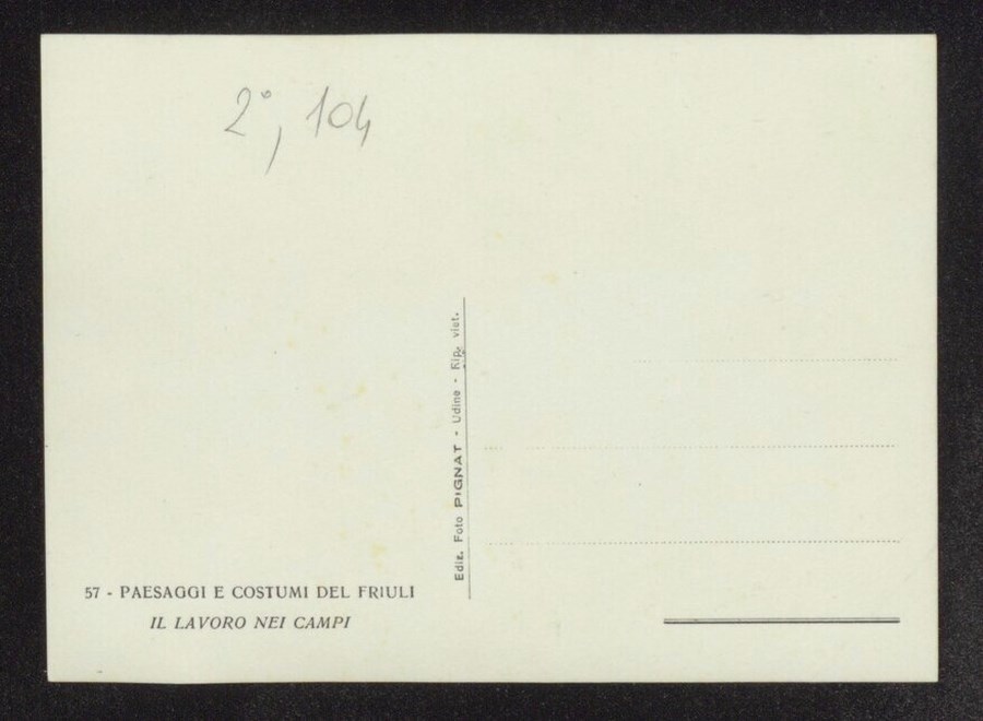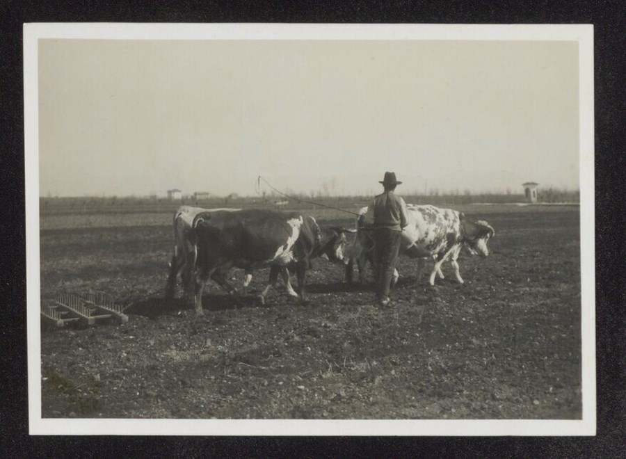 Lo scatto è parte della serie di cartoline pubblicate dal fotografo editore Carlo Pignat con il titolo "Paesaggi e Costumi del Friuli" nella seconda metà degli anni Trenta del Novecento. L'immagine ritrae un uomo al lavoro nei campi con due coppie di buoi che trainano un erpice in legno.