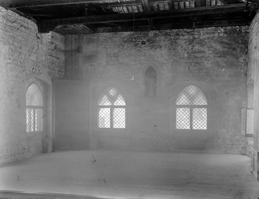 Veduta del salone al primo piano del Palazzo Comunale di Venzone; anche se la sala è priva di arredamento, sono ben visibile le belle bifore che accompagnano le pareti.