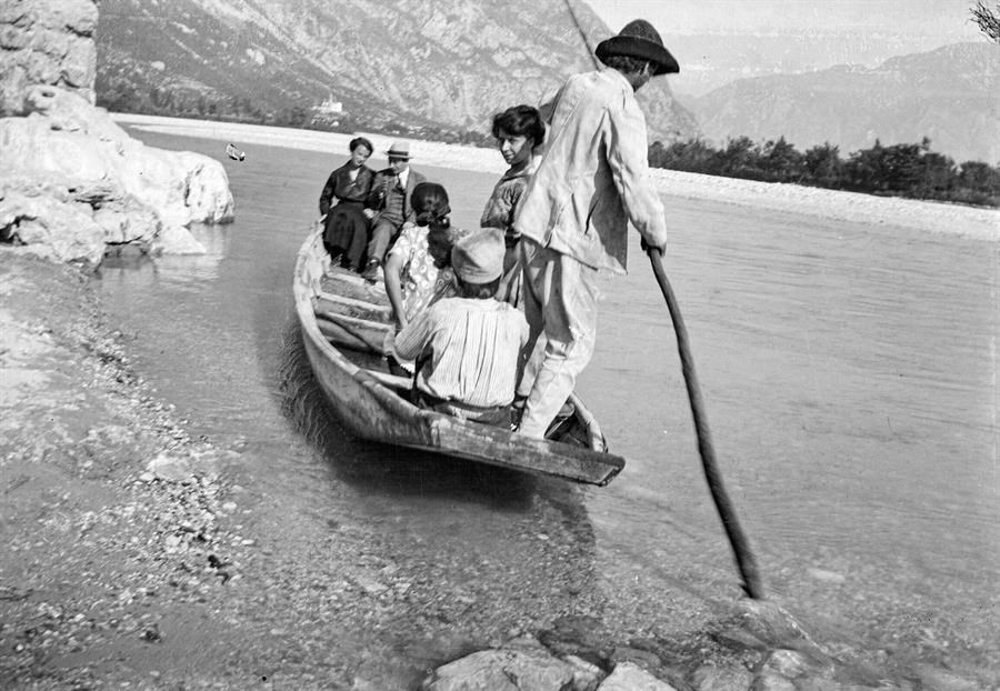 Ritratto di un gruppo di sei persone su di una piccola barca in legno mentre vengono trasportati sul fiume Tagliamento. I punti di attraversamento del fiume, tramite barca, da Venzone a Pioverno erano due, di cui uno in corrispondenza dell'attuale ponte. Dalla Guida delle Prealpi Giulie di Olinto Marinelli, pubblicata dalla Società Alpina Friulana nel 1912, sappiamo che «si traversa il Tagliamento al passo di barca di Pioverno dio sotto (tariffa per persona: in tempi normali cent. 10 per l'andata ed altrettanto per il ritorno; in casi di acque alte il prezzo può salire a L. 1 e più; l'orario è dalle 8 e mezza circa fino alle 18». Fino al 1904 la barca veniva utilizzata anche per il trasporto delle salme, per la loro sepoltura nel cimitero di Venzone, essendo stato il cimitero di Pioverno realizzato solo in quell'anno.