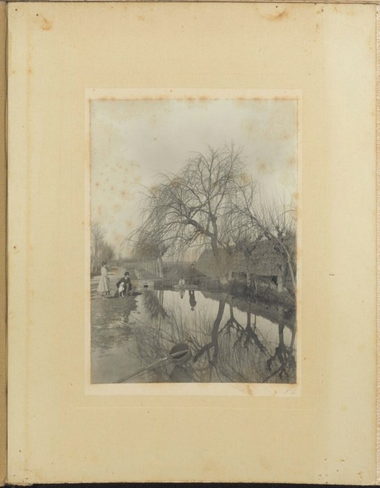 In una veduta di campagna si osserva una strada sterrata ed alberata, accompagnata su un lato da una roggia d'acqua; a sinistra un uomo accovacciato pesca sul laghetto formatosi dallo straripamento della roggia. Accanto a lui un cane bianco seduto ed una donna in piedi. A destra, sul ciglio del laghetto, un bambino ed un uomo osservano l'improvvisato pescatore. Alle loro spalle dei casoni con tetti in paglia.
