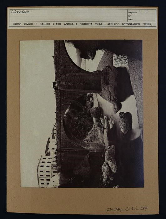 Cividale del Friuli: il Ponte del Diavolo (risalente al Quattrocento e oggetto di restauro nel 1842) sul Natisone e delle persone su di esso.