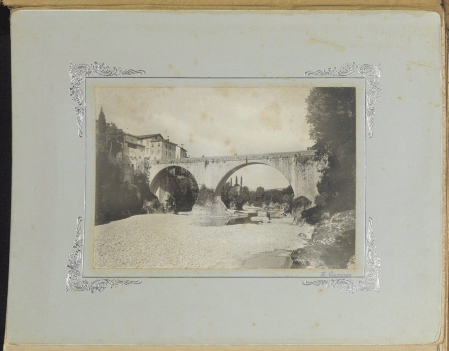 Veduta del Ponte del Diavolo di Cividale del Friuli ed il sottostante fiume Natisone; a sinistra degli edifici civili che si arroccano sulle sponde del fiume. Il Ponte è visibile nella sua interezza: costruito in pietra a partire dal 1442, distrutto e ricostruito durante le due guerre mondiali, è ripartito in due arcate, poggia su un macigno naturale collocato nel letto del fiume Natisone.
