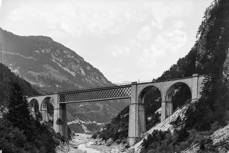 Veduta del "Ponte di Muro" in travatura metallica situato tra Dogna e Pietratagliata, frazione di Pontebba, sulla linea ferroviaria Udine-Pontebba, ufficialmente aperta il 30 ottobre 1879. Una delle strutture simbolo della linea ferroviaria tra Udine e il confine italo-austriaco di Pontebba, era proprio il “Ponte di Muro” presso il Rio di Muro, che sovrasta, alla quota di 40 metri di altezza, il letto del fiume Fella. Si tratta di una delle principali opere d’arte della ferrovia Pontebbana, lungo il Canale del Ferro, tra i paesi di Chiusaforte e Pontebba, costituita da un ponte-viadotto a cinque campate lungo 144 metri: la campata centrale, metallica, è rettilinea con un’apertura netta di 69,21 m e una distanza di 71,42 m. tra i monconi murari. Le campate laterali, due per lato, sono planimetricamente curvilinee e realizzate con pilastri in pietra con interasse 18m. che sostengono le strutture degli archi realizzati in mattoni pieni.
