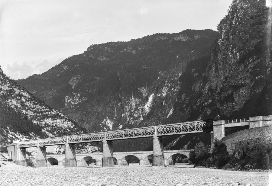 Veduta del ponte in travatura metallica della località Ponte Peraria di Chiusaforte, della Ferrovia Pontebbana, sul fiume Fella in secca. Il ponte in ferro, situato tra Resiutta e Chiusaforte, è composto da cinque campate in ferro ed è costruito in sbieco di 48° 11', sul Fella a Peraria, composto di 5 travate di ferro della lunghezza complessiva di 168 metri e della larghezza interna di 4,5 metri, alto sul piano dell’alveo 14 metri.