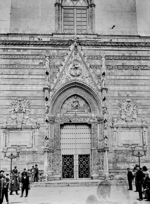 Veduta del portale maggiore del Duomo di Messina: risalente al XIV secolo ed è composto da un arco a sesto acuto, con colonne tortili poggianti su due leoni e con capitelli a forma di piante. Sulle colonne si trovano delle edicole con statue. Lungo la strombatura e gli stipiti vi sono figure umane e tralci di vite, oltre a raffigurazione di patriarchi, angeli, scene dell'antico testamento e della Madonna della lettera. L'architrave rappresenta il Cristo benedicente tra i quattro Evangelisti e i loro simboli; alle estremità vi son o due angeli con gli stemmi di Messina e degli Aragona. Nella lunetta una statua raffigura la Madonna in trono con Gesù Bambino. Un tondo, al centro, raffigura la Vergine a mani giunte e il Cristo che la incorona. Nell'immagine ai lati delle persone in attesa, immobili, per lo scatto fotografico che deve incorniciare il portale.