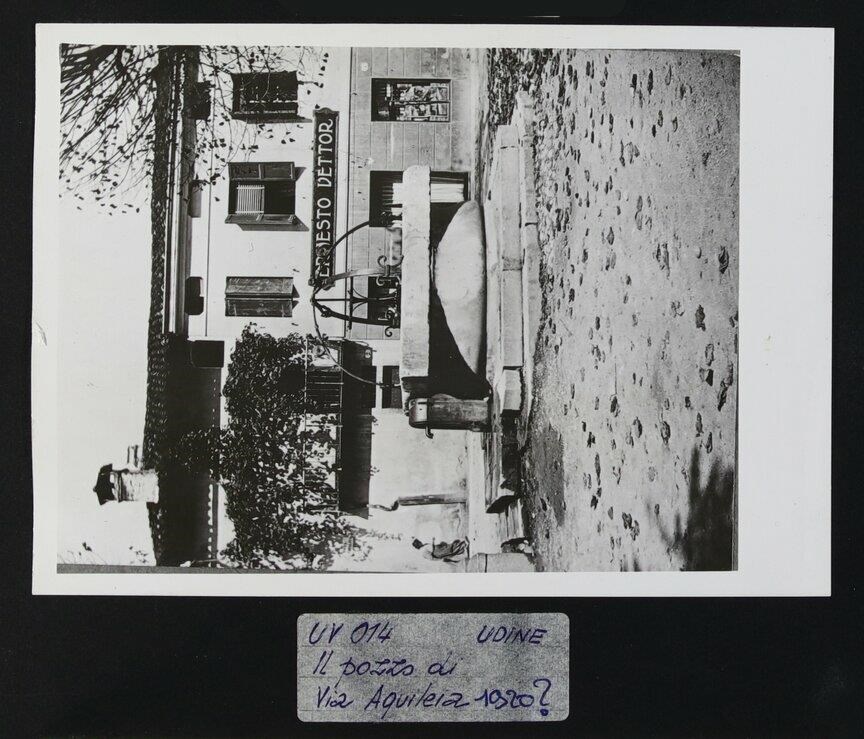 Udine, via Aquileia (piazzetta del Pozzo): cisterna con una lastra di ferro come copertura (inizio del Cinquecento). A sinistra, signore che cammina con la testa bassa.