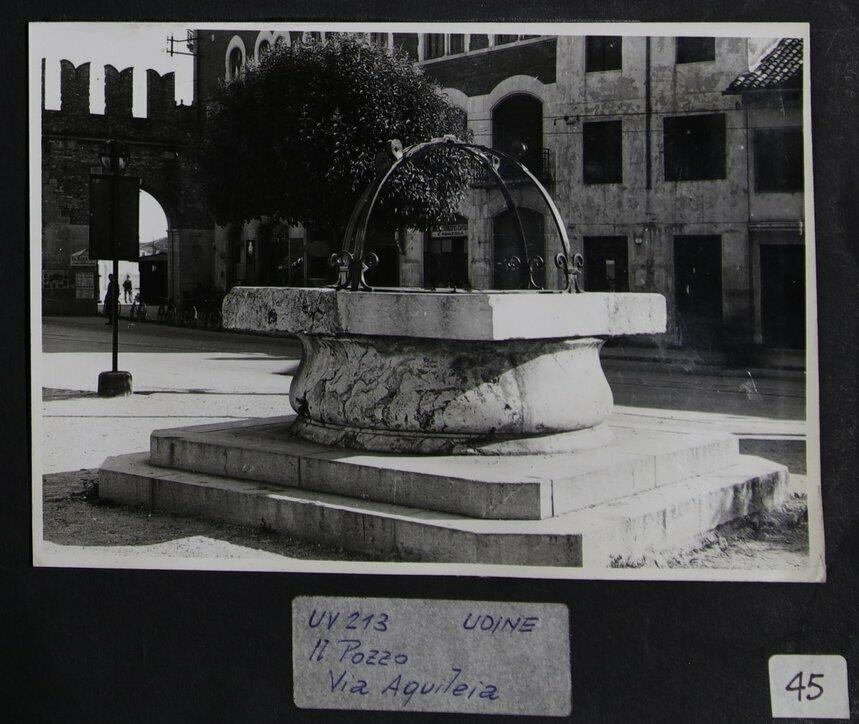 Udine, piazzetta del Pozzo: cisterna (primi anni del Cinquecento) con una lastra di ferro come copertura. In secondo piano a sinistra, Porta Aquileia (metà del Trecento), quinta cerchia muraria.