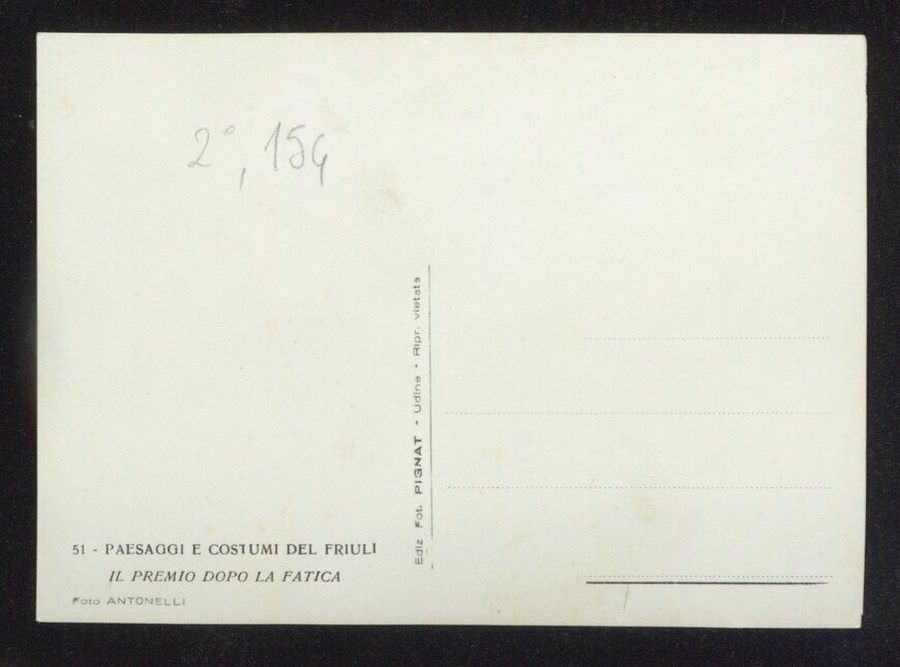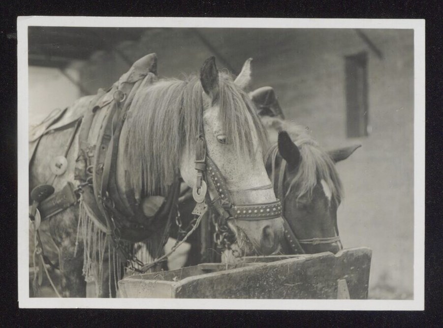 Lo scatto di Umberto Antonelli, farmacista e fotografo attivo in Carnia tra 1909 e 1949, è parte della serie di cartoline pubblicate dal fotografo editore Carlo Pignat con il titolo "Paesaggi e Costumi del Friuli" nella seconda metà degli anni Trenta del Novecento, raffiguranti tutte una Carnia e un Friuli arcadici. L'immagine ritrae una coppia di cavalli con i finimenti da lavoro, alla mangiatoia.