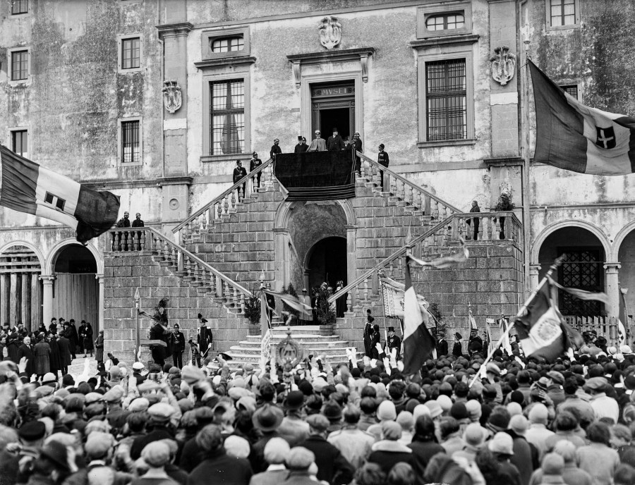 Immagine del Principe Umberto II di Savoia mentre si affaccia allo scalone del cortile del Castello di Udine, ingresso verso i Musei Civici, e saluta la folla che lo acclama con il saluto romano.