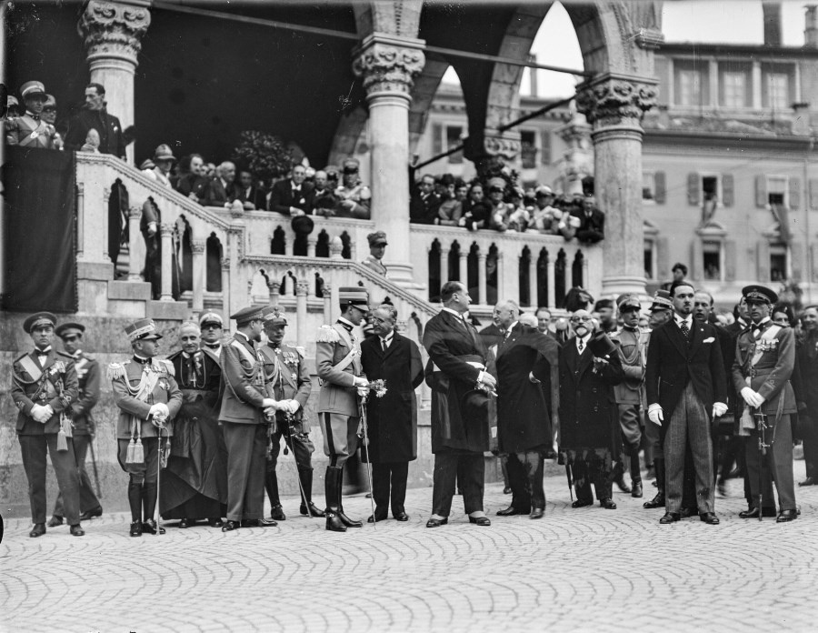 Il Principe Umberto II di Savoia in visita a Udine: insieme ad altri ufficiali dell'esercito e nobili davanti alla Loggia del Lionello.
