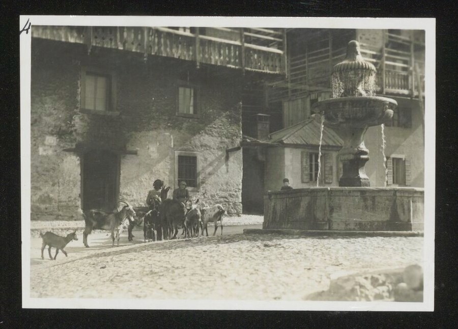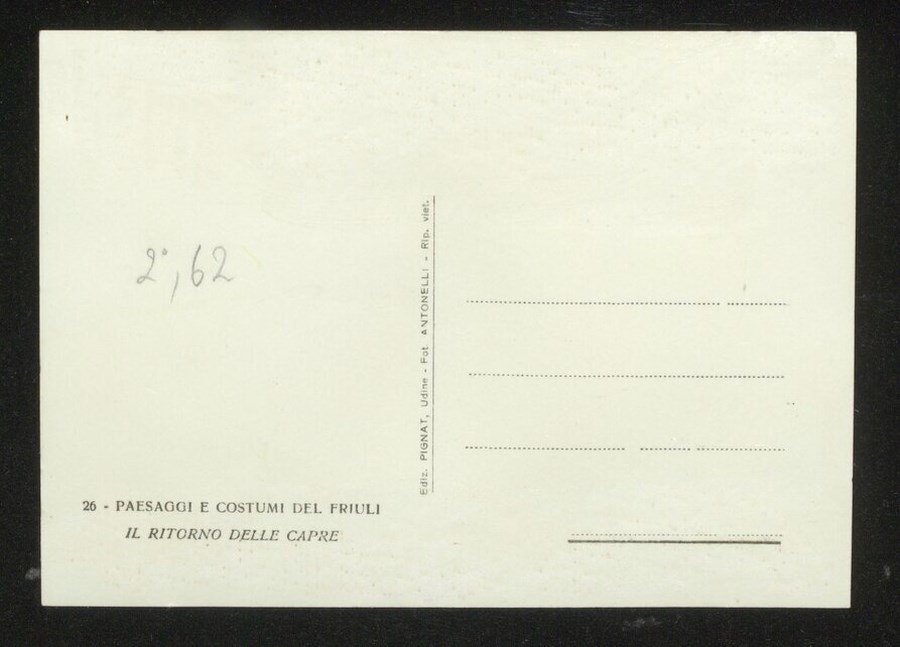 Lo scatto di Umberto Antonelli, farmacista e fotografo attivo in Carnia tra 1909 e 1949, è parte della serie di cartoline pubblicate dal fotografo editore Carlo Pignat con il titolo "Paesaggi e Costumi del Friuli" nella seconda metà degli anni Trenta del Novecento, raffiguranti tutte una Carnia e un Friuli arcadici. L'immagine ritrae alcune donne in abiti tradizionali carnici, nei pressi della fontana di Tredolo a Forni di Sotto, mentre rientrano dai pascoli con le capre.