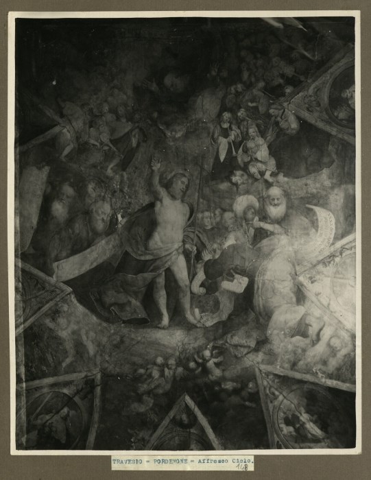 Riproduzione fotografica degli affreschi nel soffitto del coro raffigurante "Il trionfale ingresso di San Pietro alla gloria celeste" del Pordenone eseguiti nell'abside poligonale della Chiesa di San Pietro Apostolo a Travesio, uno dei cicli a fresco più ampi conservatosi dell'artista.