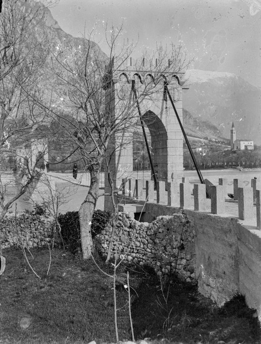 Veduta del vecchio ponte sul fiume Tagliamento che collegava Venzone alla località di Pioverno; alcune persone transitano sul ponte e in lontananza è visibile la Chiesa del borgo di Pioverno.