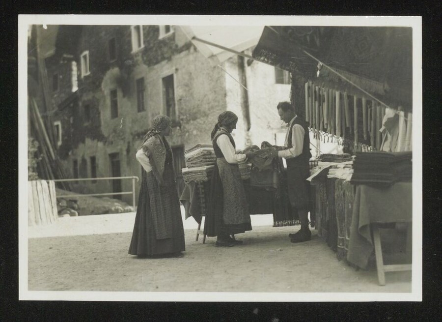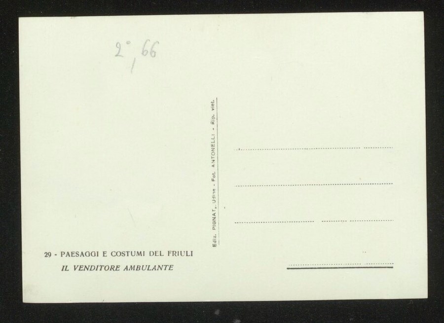 Lo scatto di Umberto Antonelli, farmacista e fotografo attivo in Carnia tra 1909 e 1949, è parte della serie di cartoline pubblicate dal fotografo editore Carlo Pignat con il titolo "Paesaggi e Costumi del Friuli" nella seconda metà degli anni Trenta del Novecento, raffiguranti tutte una Carnia e un Friuli arcadici. L'immagine ritrae due donne in abiti tradizionali friulani con un venditore di tessuti, davanti ai suoi banchetti di vendita.