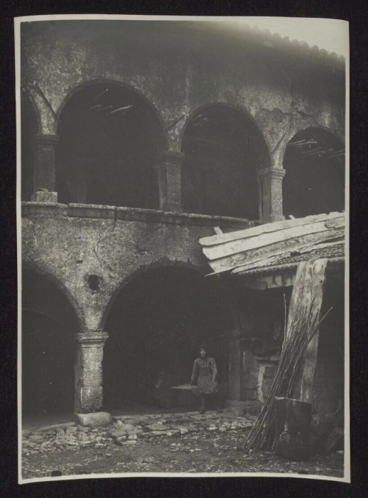 Cortile di una tipica casa carnica di proprietà di un gismano con portico, sotto il quale siede un bambina, e loggia ad archi ad Illegio, frazione di Tolmezzo. Il gismano o gesmano, è il nome con il quale fu indicato in Carnia, durante la dominazione veneta, il capofamiglia feudatario, che con altri del suo rango costituiva una vicinia.