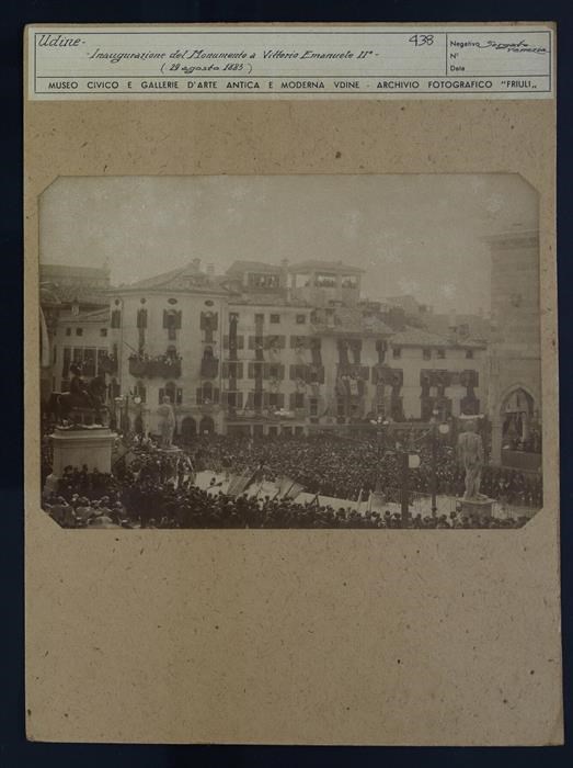 Udine: veduta di uno scorcio di piazza Contarena (piazza Libertà). In basso, le statue seicentesche di Ercole e di Caco in pietra d'Aurisina, realizzate dallo scultore Angelo de Putti. A destra si intravede la Loggia del Lionello, finita di costruire per volere di Nicolò Lionello. A sinistra, il monumento equestre in bronzo dedicato al re Vittorio Emanuele II, collocato al centro della piazza (spostato nel 1947 nel Giardino Ricasoli). La fotografia è stata scattata il giorno dell'inaugurazione del monumento equestre, il 26 agosto 1883, a cui ha assistito una grande folla di persone. Alcuni astanti, dalle finestre, hanno tirato fuori un panno come omaggio (da un balcone, si vede anche la bandiera del regno con il vessillo reale).