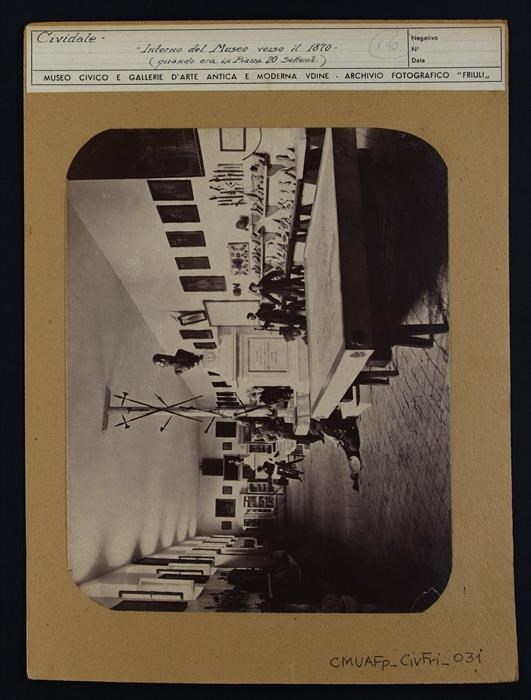 Cividale del Friuli: l'interno del Museo archeologico, ubicato al tempo in piazza XX Settembre. Sono rappresentanti sette uomini, di cui uno legge il giornale e uno mendica. Al centro della sala espositiva, due busti bronzei su un massiccio basamento con epigrafe. Sulla parete di sinistra le finestre sono aperte e, sulle pareti di destra e in fondo, sono appesi dei quadri. Sono conservati anche reperti archeologici, calchi, antichità e la sezione lapidaria.