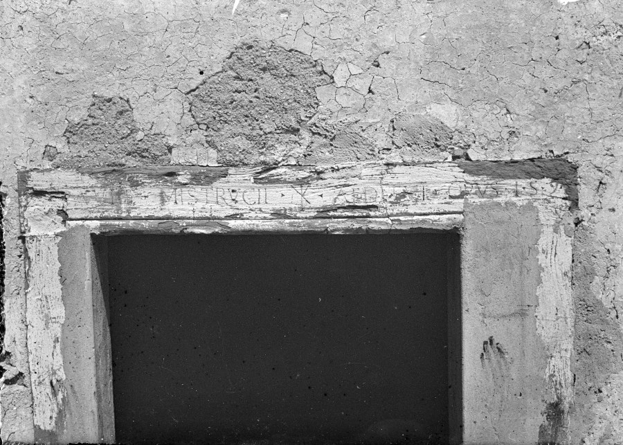 Riproduzione fotografica del particolare di un'iscrizione sopra l'architrave in legno stuccato di una porta.
