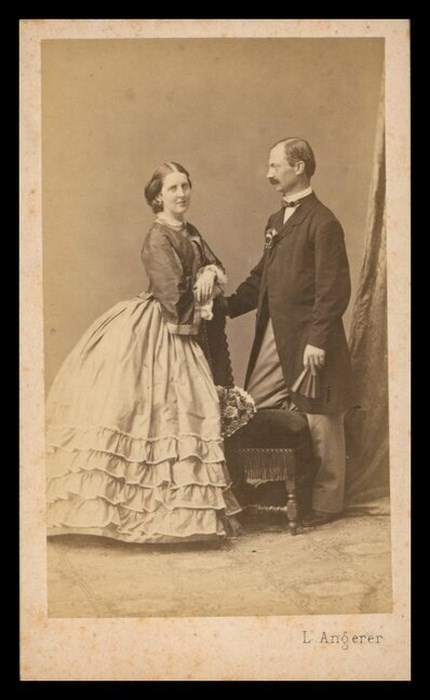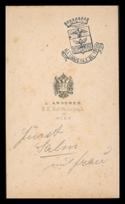 Ritratto in studio a figura intera dei coniugi Salm. Una poltroncina unisce la coppia durante lo scatto fotografico: la moglie appoggiata alla spalliera della poltroncina fissa l'obbiettivo, mentre il marito, Jurst Salm, con il ginocchio destro sulla poltroncina, ammira l'amata.