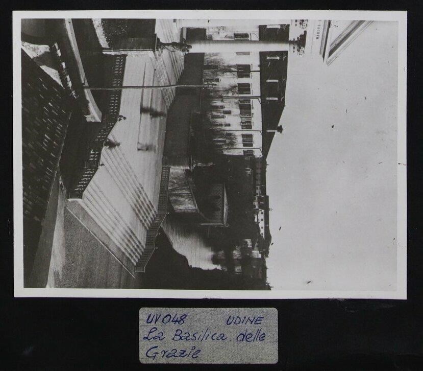 Udine, piazza I Maggio: a sinistra, veduta della scalinata e del pronao (1838-1841, 1850-1851), con timpano e quattro colonne (in pietra bianca di Brioni), appartenenti al santuario della Beata Vergine delle Grazie. Il pronao è stato progettato dall'architetto Valentino Presani. Sotto la scalinata, la roggia di Palma.