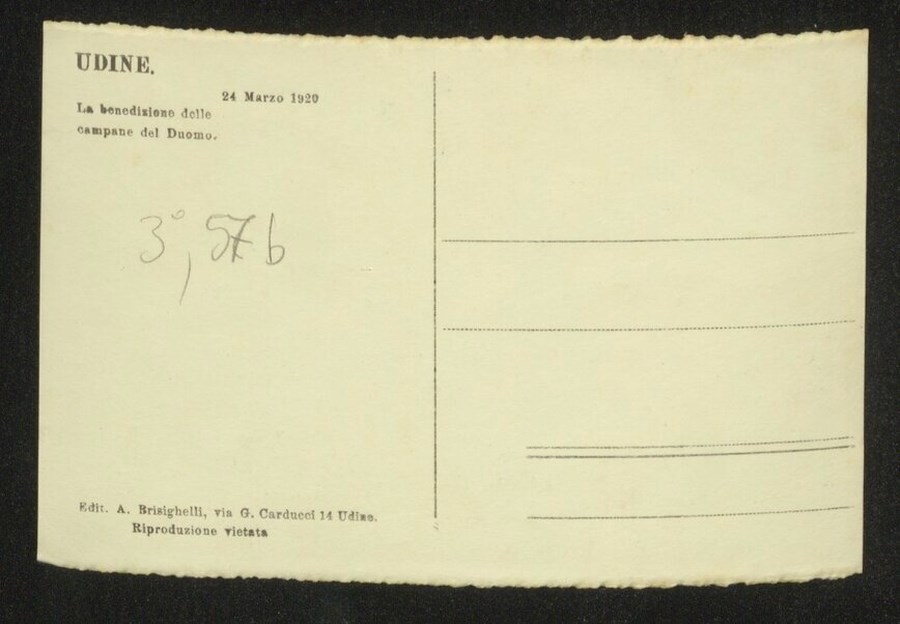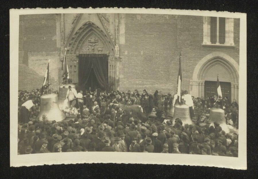 Folla di fedeli dinanzi accanto alle campane del Duomo di Udine nel giorno della loro benedizione, il 29 Marzo 1920.