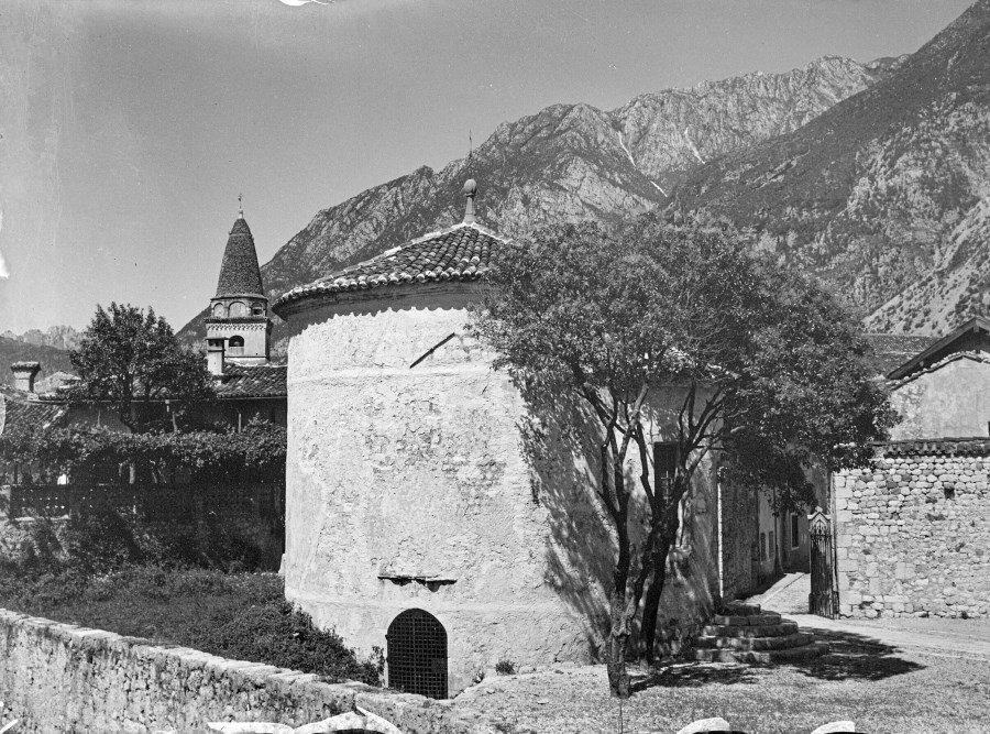Veduta laterale della Cappella di San Michele a Venzone, del campanile della Chiesa di San Giovanni Battista e delle montagne sullo sfondo.