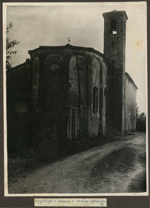 Veduta dell'esterno della parte posteriore della Chiesa della Beata Vergine del Rosario nel borgo di Romano, nella frazione di Vigonovo di Fontanafredda. Nell'immagine vediamo la parte posteriore dell'edificio sacro, in cui si scorgono il campanile a pianta quadrata addossato alla chiesa e l'abside poligonale.