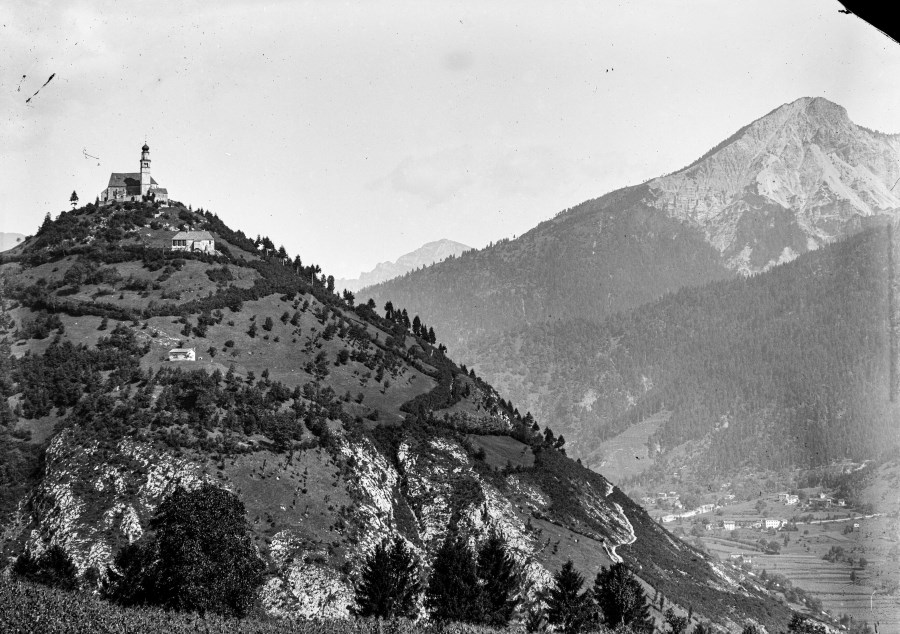 Veduta della Chiesa di San Pietro Apostolo in Carnia di Zuglio. La Pieve, come visibile nell'immagine, si trova sul colle omonimo che sovrasta l’abitato di Zuglio attorniata dalle montagne.