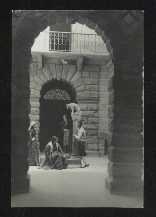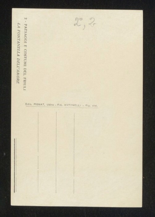 Lo scatto di Umberto Antonelli, farmacista e fotografo attivo in Carnia tra 1909 e 1949, è parte della serie di cartoline pubblicate dal fotografo editore Carlo Pignat con il titolo "Paesaggi e Costumi del Friuli" nella seconda metà degli anni Trenta del Novecento, raffiguranti tutte una Carnia e un Friuli arcadici. L'immagine ritrae tre donne e un uomo in costume popolare friulano all'interno del cortile di palazzo Frangipane a Tarcento; l'uomo è appoggiato alla colonna con la statua del leone.