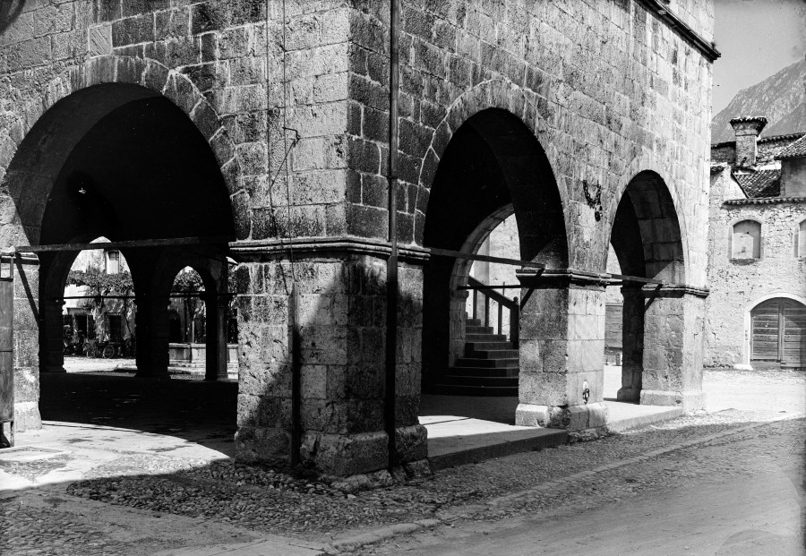 La loggia del Palazzo comunale di Venzone vista da via Glizoio di Mels. Attraverso gli archi a sesto acuto si intravedono la fontana di Piazza Municipio ed alcune biciclette appoggiate alle pareti dei palazzi.
