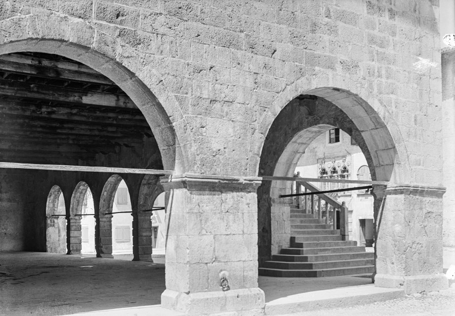 La Loggia del Palazzo Comunale di Venzone e la scalinata che conduce al salone del primo piano. Si scorge una trifora del Palazzo in Piazza Municipio.