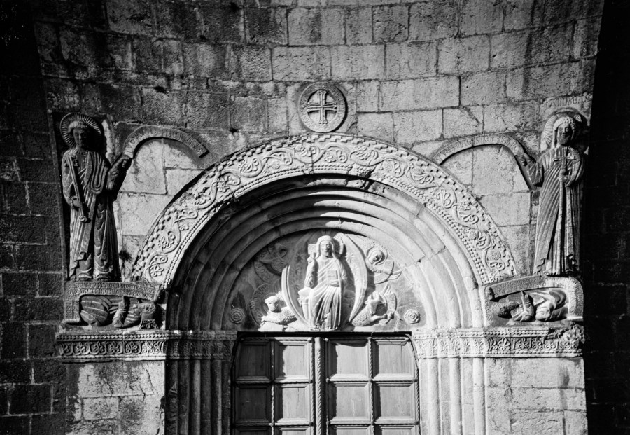 Riproduzione fotografica della lunetta sopra il portale di ingrasso del Duomo di Venzone e raffigurante il "Cristo benedicente" fra i simboli dei quattro Evangelisti. Tutti i portali sono ad opera del "maestro Giovanni" nel 1308 circa. Ai lati delle figure di Santi con iscrizioni in bassorilievo.
